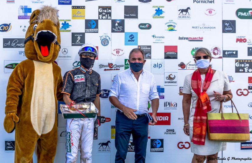 Remise de prix avec le driver vainqueur Eric Raffin sur le podium en compagnie de Monsieur le Maire de Pornichet, Jean-Claude PELLETEUR et son adjointe ainsi que la mascotte Ponychet.